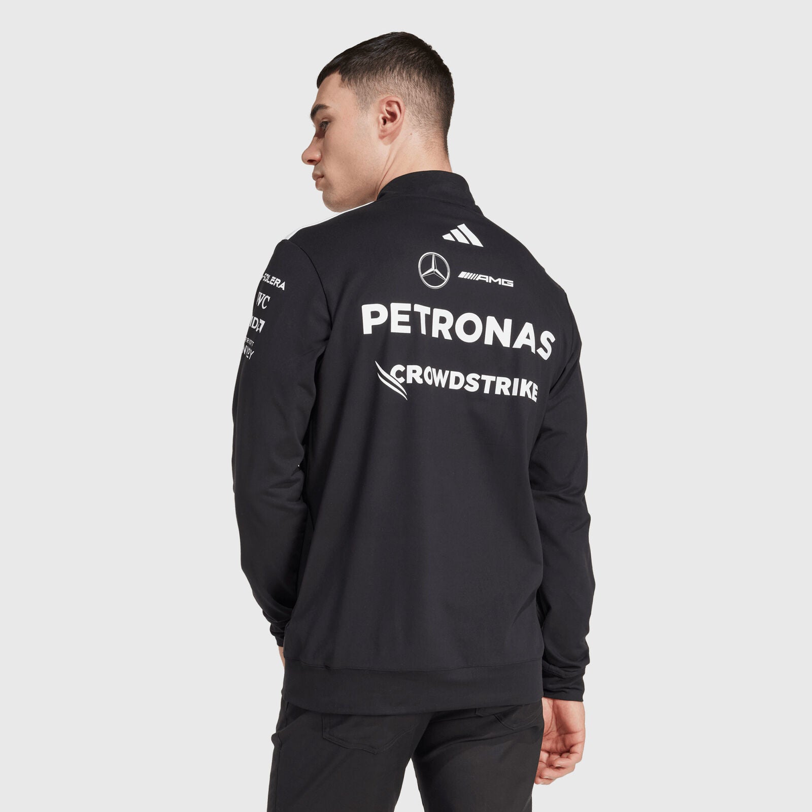 Regular fit. Quarter zip with stand-up collar. 85% polyester (recycled), 15% elastane. Mercedes - AMG Petronas Formula One Team logo. "Petronas" on back. Contains a minimum of 70% recycled and renewable content.