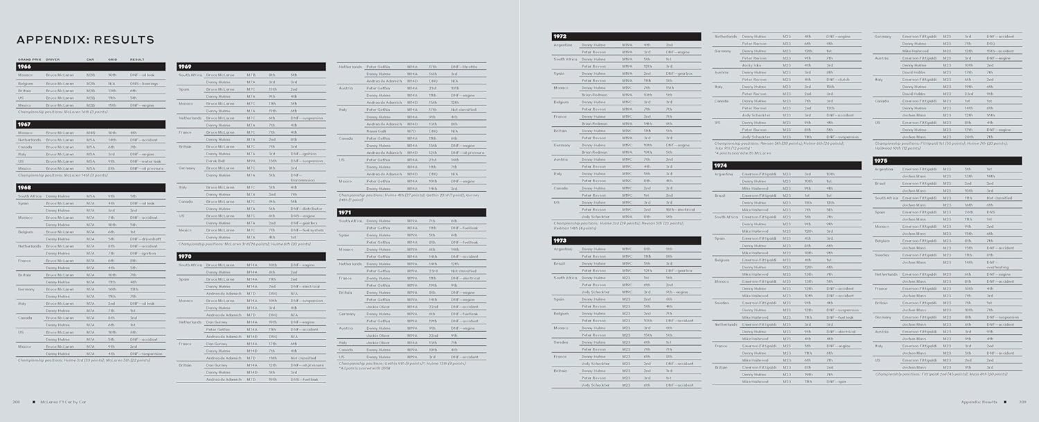McLaren Formula 1 Car by Car chronicles every McLaren Formula 1 car in chronological order, featuring an overview of each car’s significant features and evolution, its technical specifications, and its competition record accompanied by historic and contemporary images.