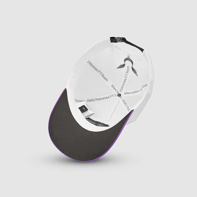 Mercedes-AMG F1 Hamilton Trucker Hat 2024 White The official replica 2024 Lewis Hamilton Driver Cap, for the first time in a trucker style design complete with mesh rear panels. Available in a number of colour options, all feature Lewis driver number and logo, alongside an embroidered Mercedes logo and contrast colour sandwich peak. Embroidered Mercedes Star on the front, Team logo flag label at the back, Driver branding at the back, Contrast colour peak, Driver number '44' on peak, Towelling head band. Material: 100% polyester