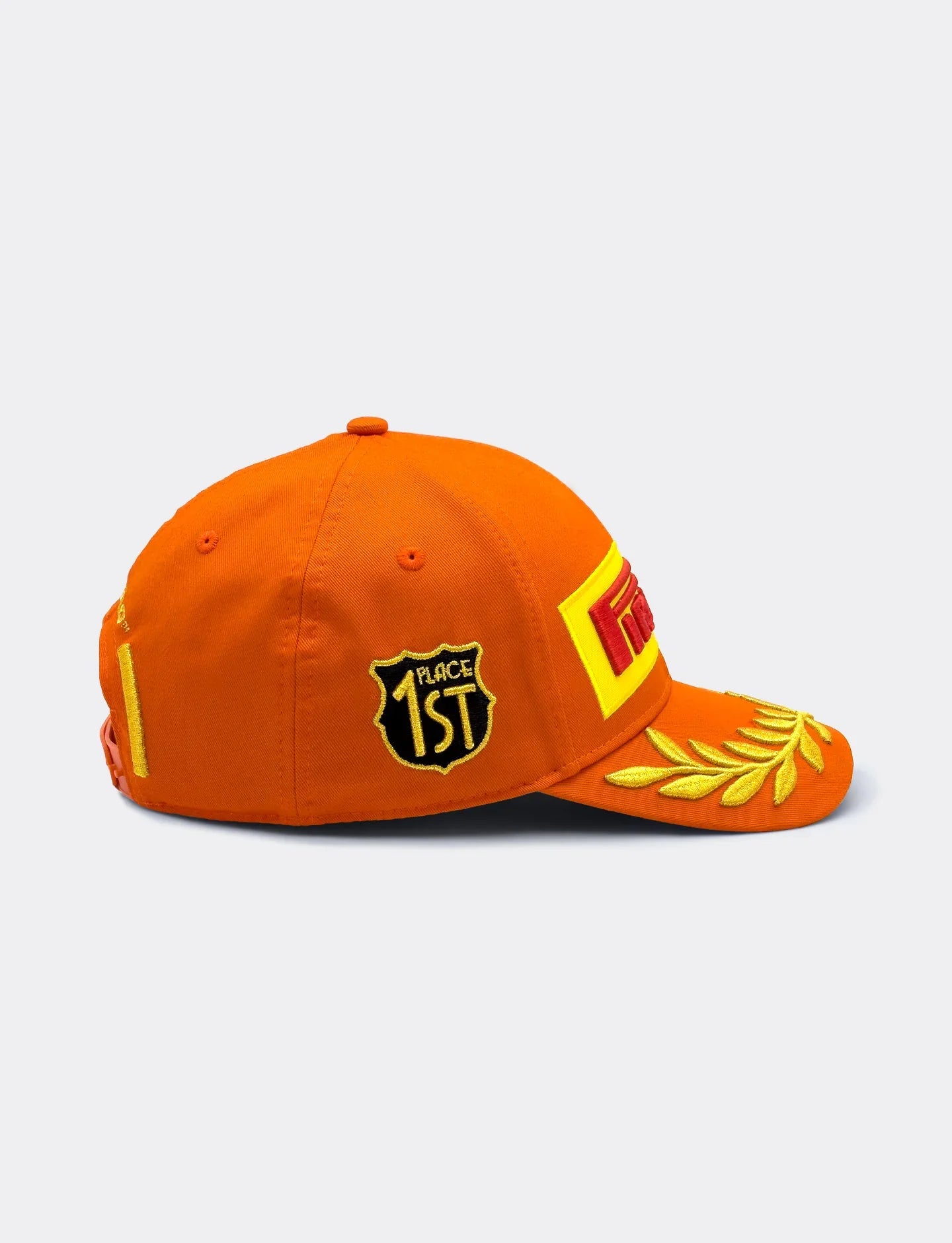 The Pirelli Podium Cap – Special Edition Spain brings the heat of the Formula 1® Barcelona circuit to a bold, race-ready design. Drenched in vivid orange and finished with gold and black trimmings, it features the Pirelli logo patch on the front and gold-stitched laurel detailing at the brim—a nod to podium glory. A woven Spanish flag tag and official Grand Prix date mark this cap as a true collector’s piece. Built on the same silhouette worn by race winners, it’s made for fans who live for the roar of Circuit de Barcelona-Catalunya®. Limited run—celebrate Spain in style before it’s gone.