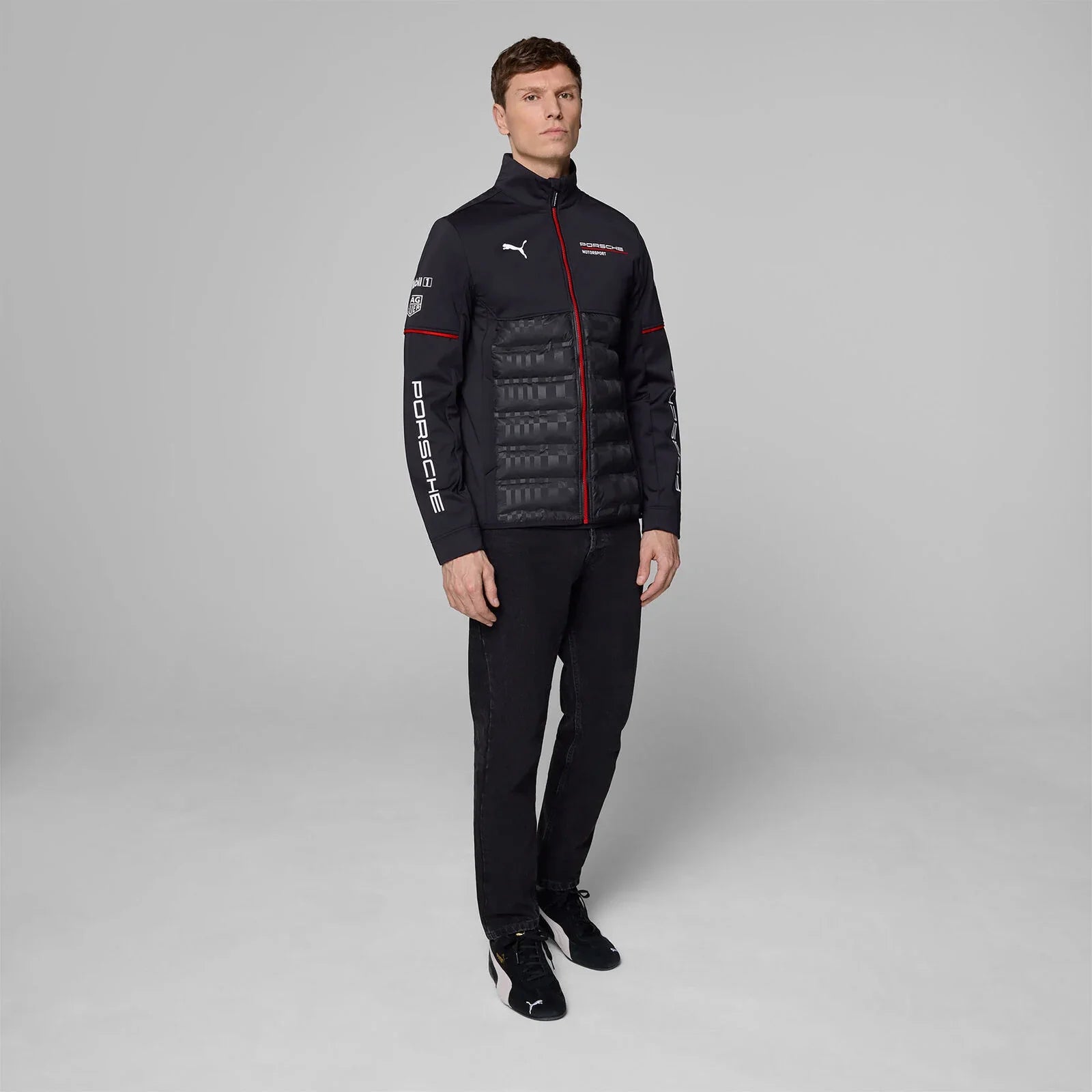 Part of the official Porsche Motorsport PUMA Team collection, the Team Hybrid Jacket combines a woven upper with a padded lower section for ultimate comfort. Produced using the latest techniques and materials, it features all the official Porsche Motorsport team/sponsor branding and details, including PUMA logos.