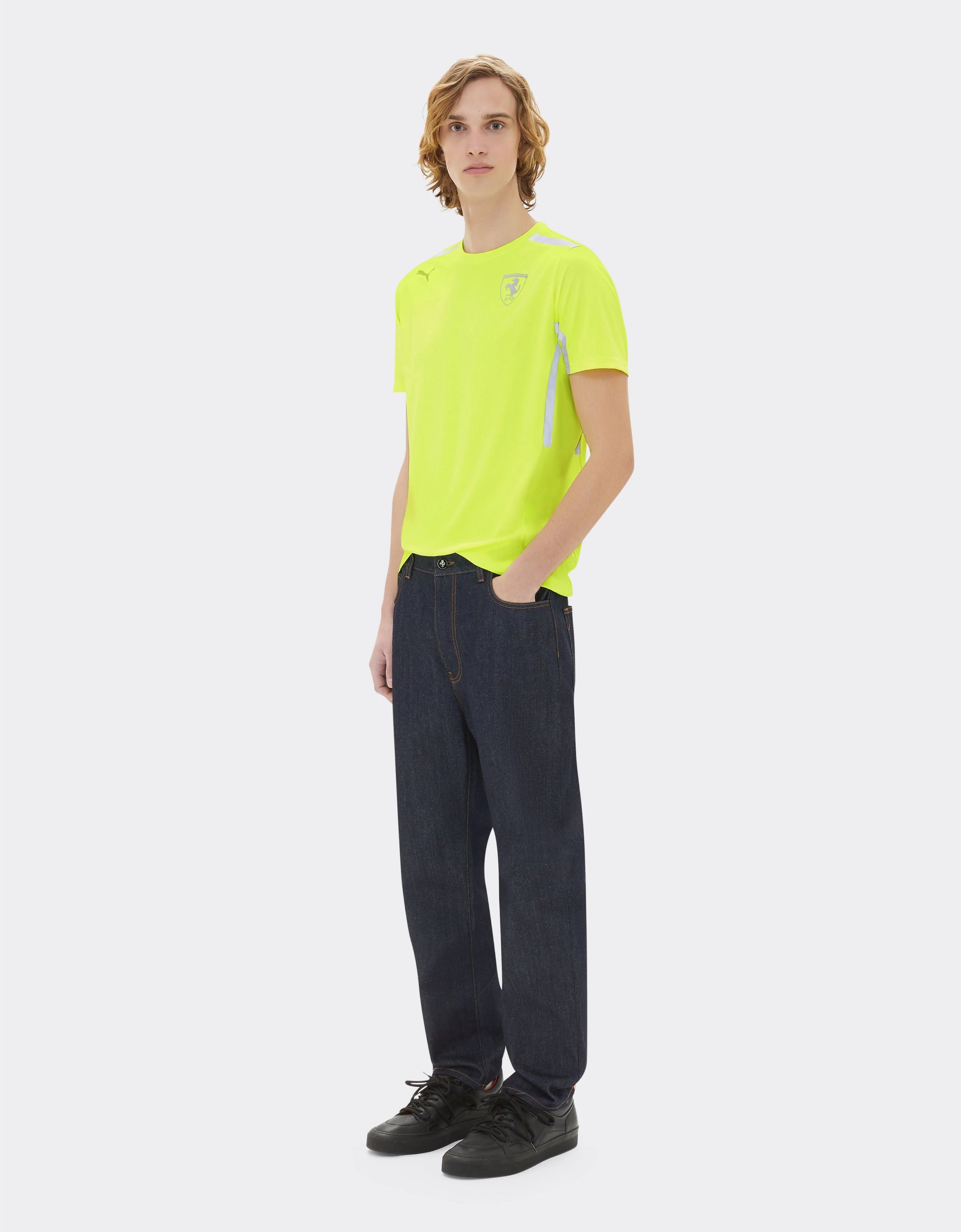 The official 2025 Scuderia Ferrari Team Set Up T-shirt from PUMA, recognisable as being worn throughout the 2025 Formula 1 season by the Scuderia garage crew. High visibility neon yellow T-shirt, with reflective Ferrari and PUMA branding.
