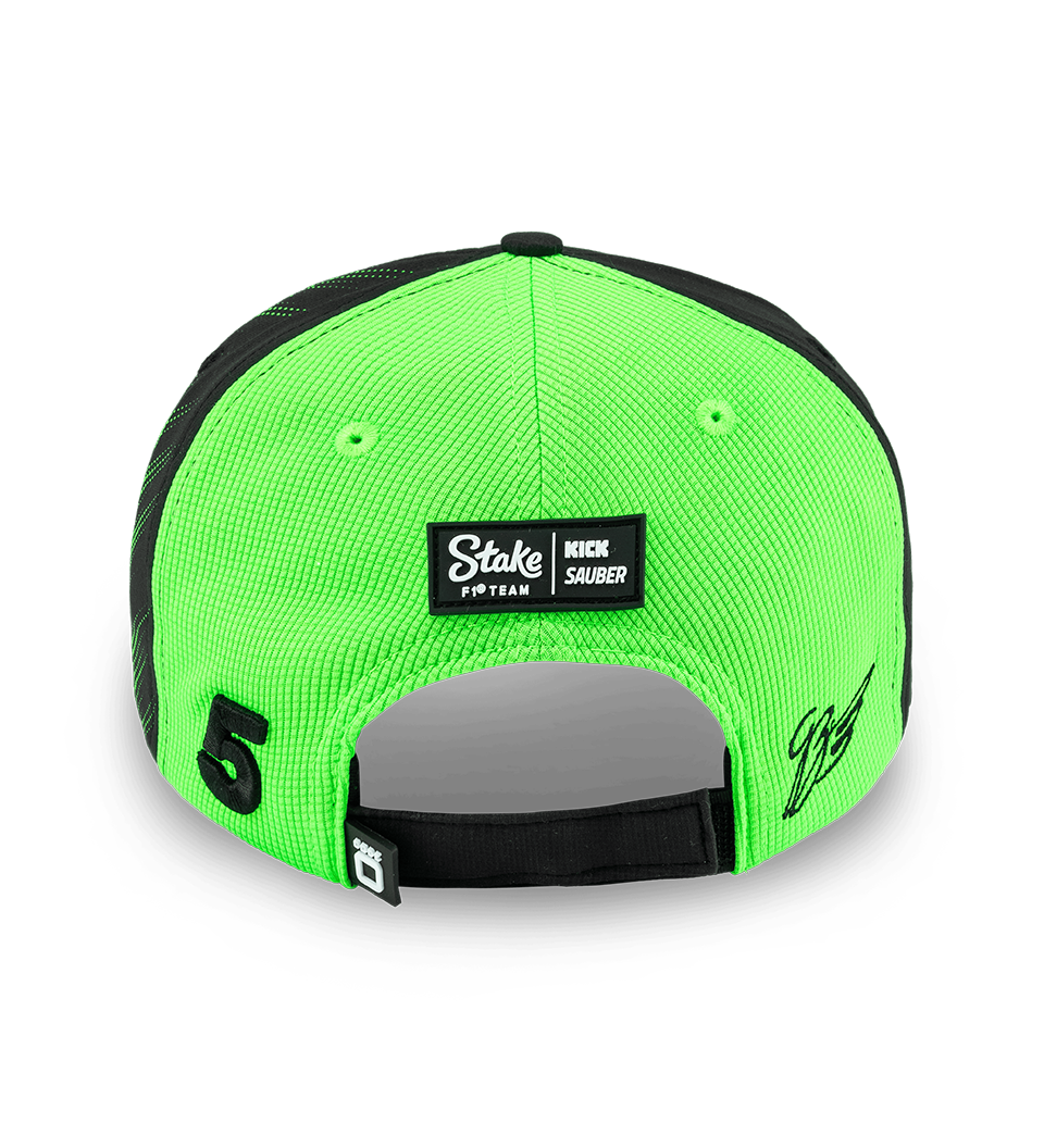 The official Stake F1 Team / Kick Sauber 2025 Gabriel Bortoleto Team Cap, complete with driver number 5 on front and rear, official green and black team colors, and adjustable rear strap.