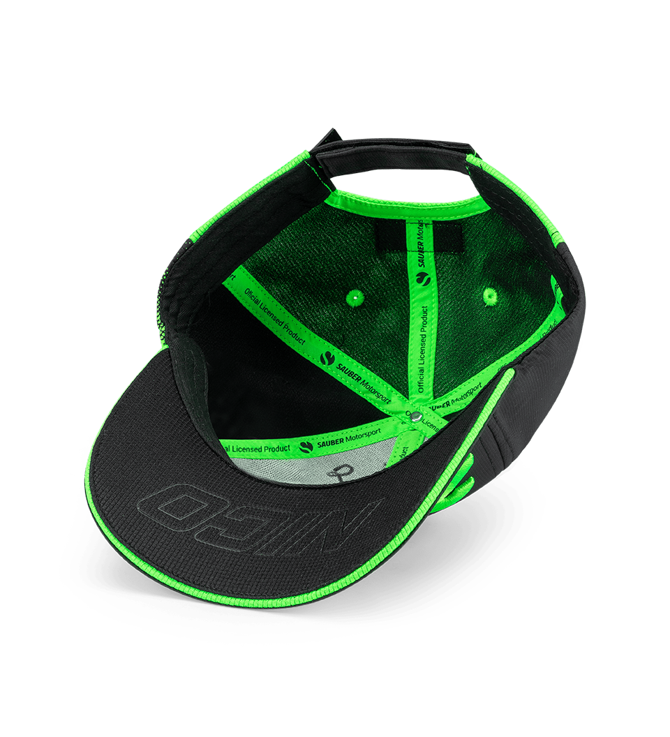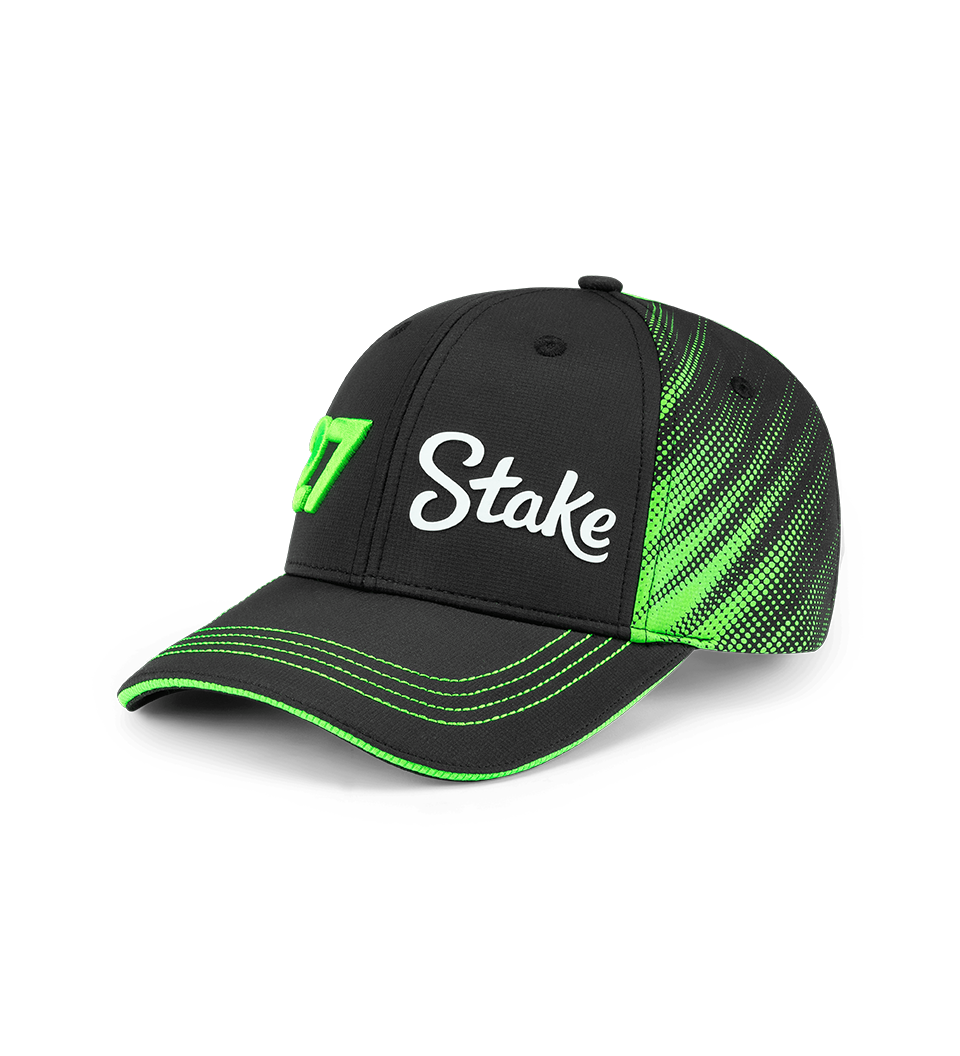 The official Stake F1 Team / Kick Sauber 2025 Nico Hülkenberg Team Cap, complete with driver number 27 on front and rear, official green and black team colors, and adjustable rear strap.