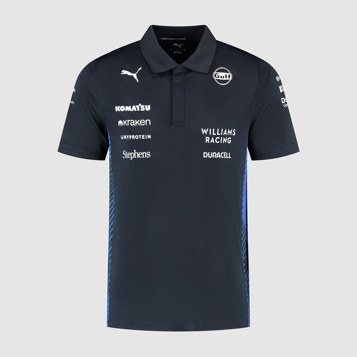The official 2025 Atlassian Williams Racing Men's Team Replica Polo. With official team and selected sponsor branding, the polo features a concealed branded button placket with twin needle stich on cuff and hem Williams Camo side panel detail.